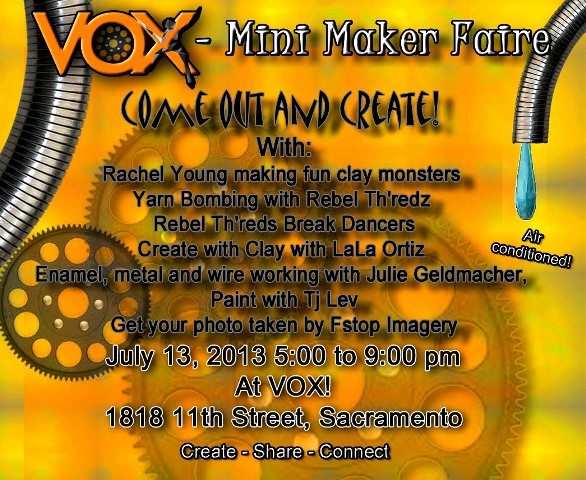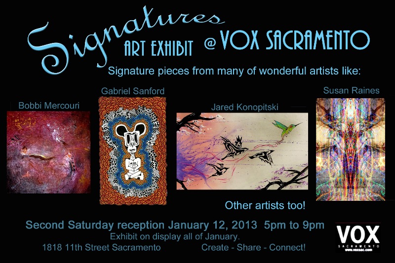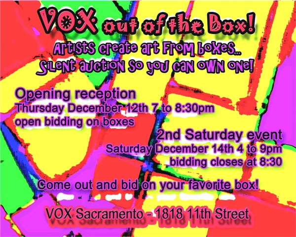 December 2012 Second Saturday VOX Sacramento has a fun show this month. VOX out of the BOX! Artists were given a box to create something with! There are almost 50 artists participating including me, this is a VOX fundraiser, with a silent auction on December 20th. For more information see the attached card!