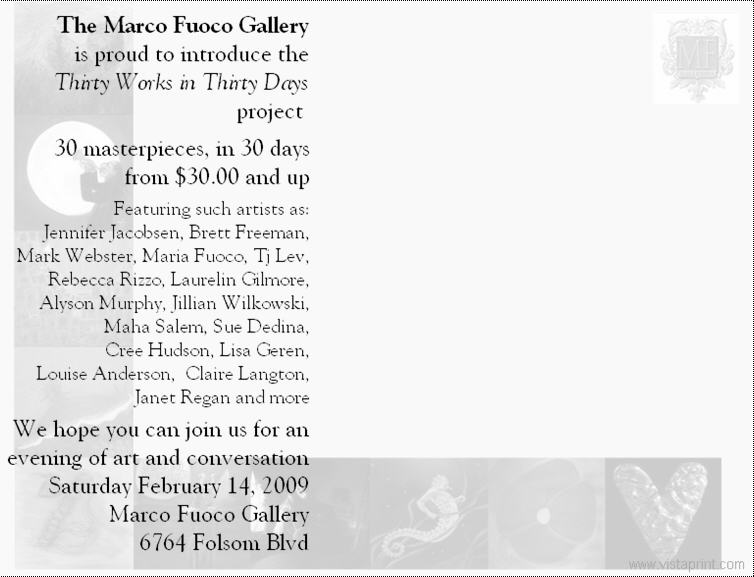 I am participating in The Marco Fuoco Gallery's art exhibition “Clothing Optional” with a Second Saturday Reception on July 11th, 2009, at the Marco Fuoco Gallery, 6764 Folsom Blvd, 7:00 to 11:00 PM. See Postcard for more info!